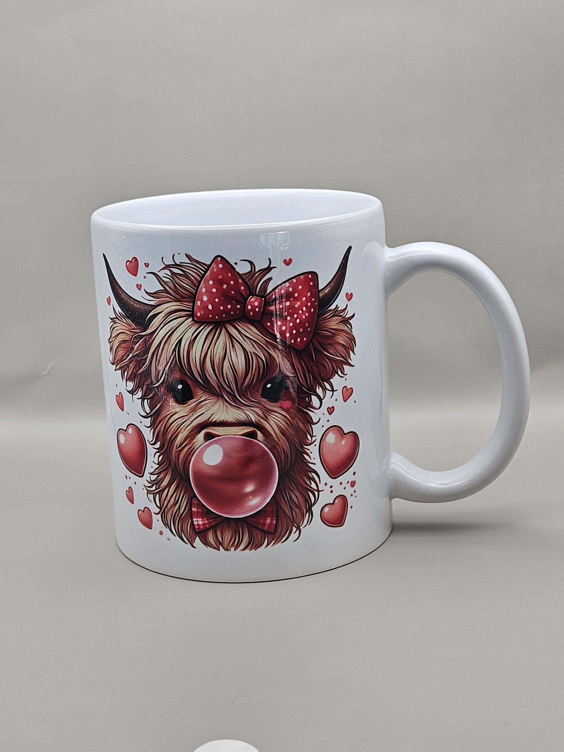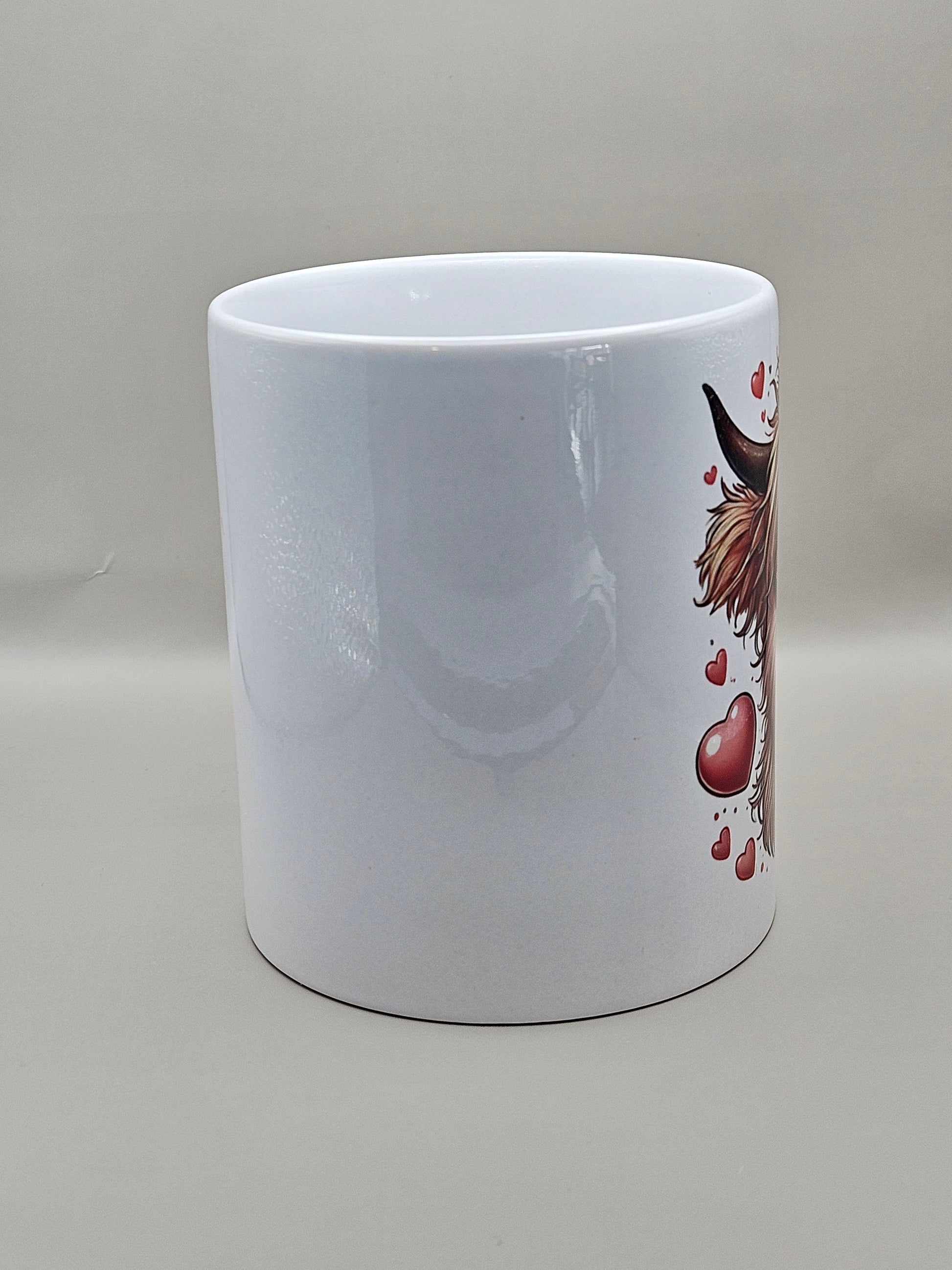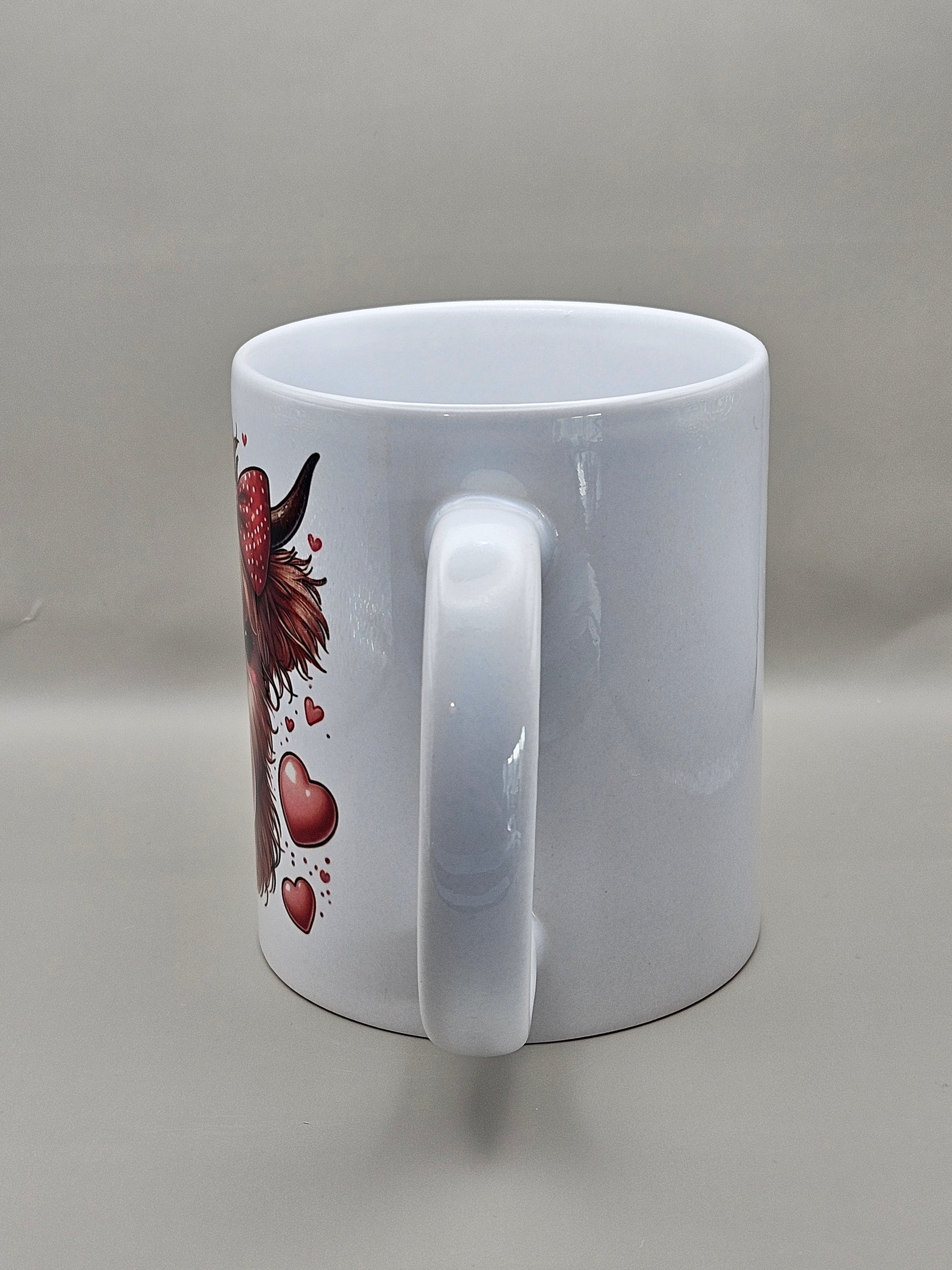 "Share some love with this adorable Highland cow mug! Featuring an 11oz ceramic design, this mug is the perfect way to start your day with a heartwarming cup of coffee. Bring some cuteness to your kitchen and make your mornings a little more delightful. Perfect for Valentine's Day!"